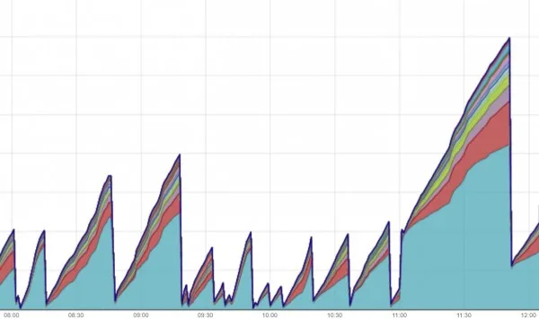 Cada pico positivo y negativo en la parte superior del mempool muestra un bloque que se está procesando. En bitcoin, el tamaño de bloque de 1 MB sólo elimina porciones de la transacción en espera, comenzando con las que tienen las tarifas más altas. Pero el tamaño de bloque de 8 MB de Bitcoin Cash elimina grandes cantidades del mempool.