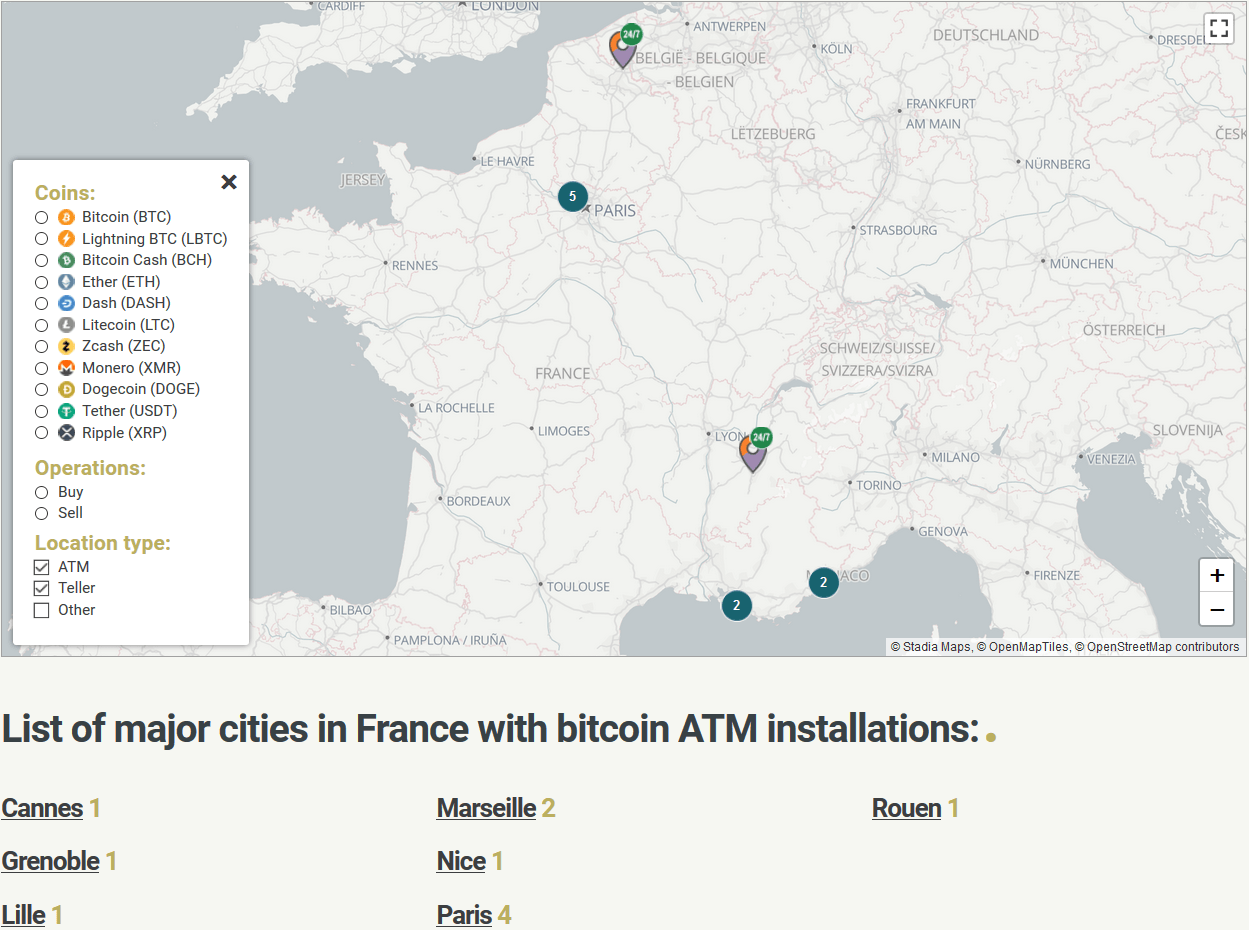 Another way to buy Bitcoins in France is through automated teller machines (ATMs). These ATMs allow users to instantly purchase and sell cryptocurrency using cash, however most of them require at least a phone number, so they aren't totally private.