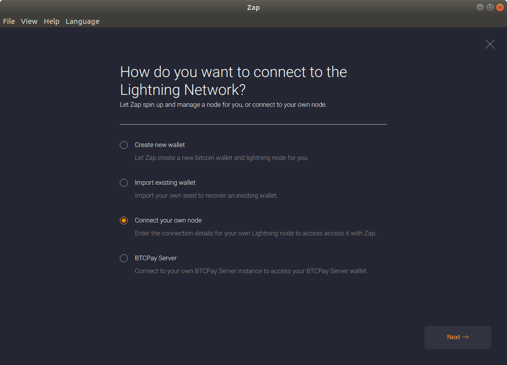 To authenticate the app and the server, we’ll need to pass data from our server to the phone. When connecting Zap on the desktop, two files are copied over to our machine, but that’s not possible on a phone. Instead, use a tool called lndconnect that will generate a QR code for us.