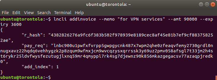 The result will include a r_hash, a pay_req and an add_index. The pay_req is our invoice that we can pass on.