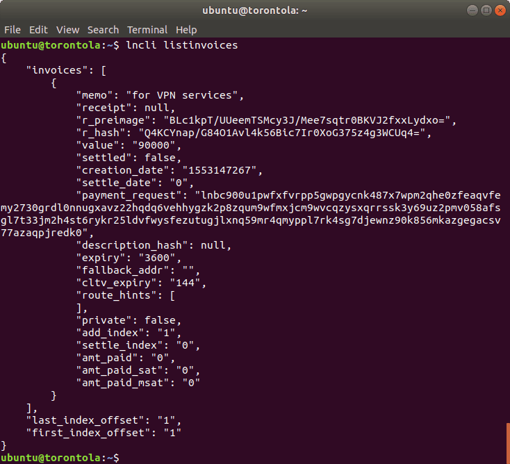 See the invoices issued and their status with the command: . Below, we can see that the invoice we issued above has not yet been paid, as “settled” is set to false.