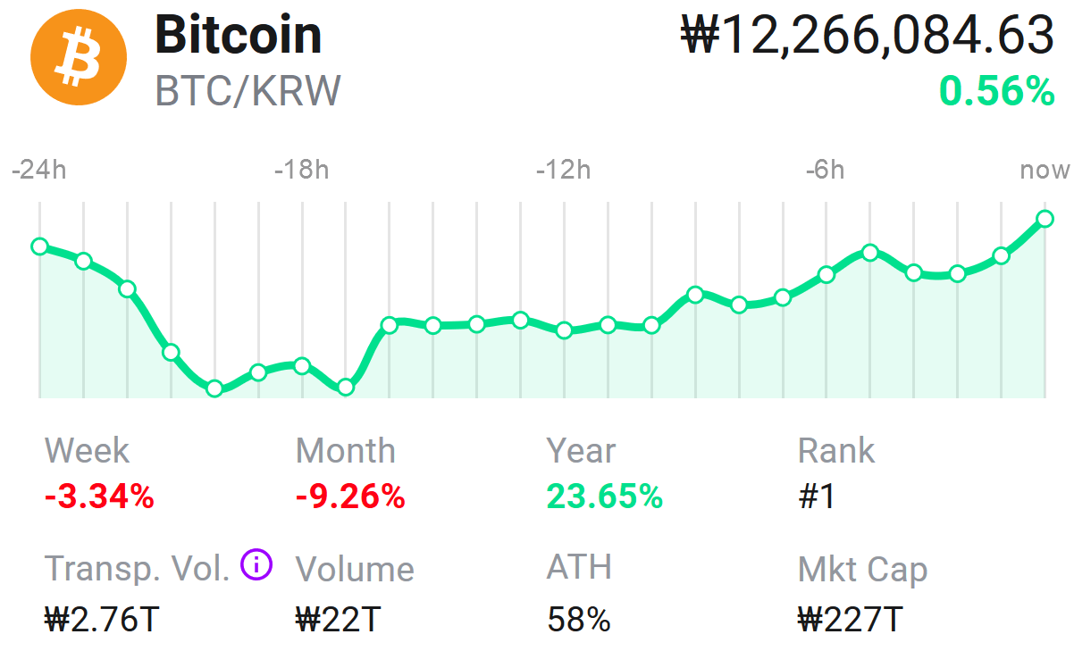 The current price of Bitcoin in South Korea is ₩12,266, however this amount changes every minute, so always check the value on your local exchange.
